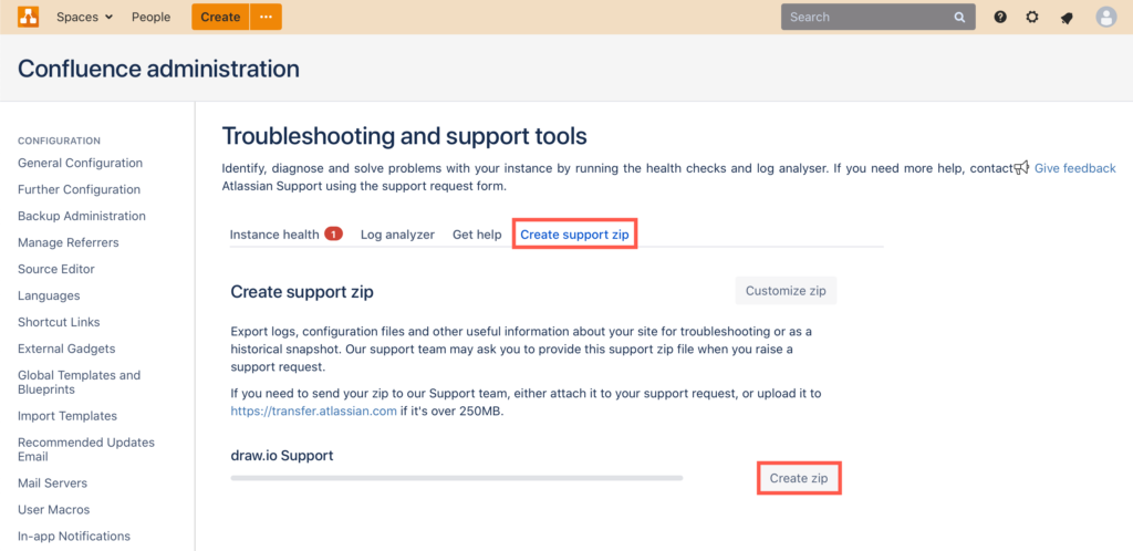 单击“创建支持zip”选项卡,然后在“ draw.io支持”旁边,单击“创建zip”。