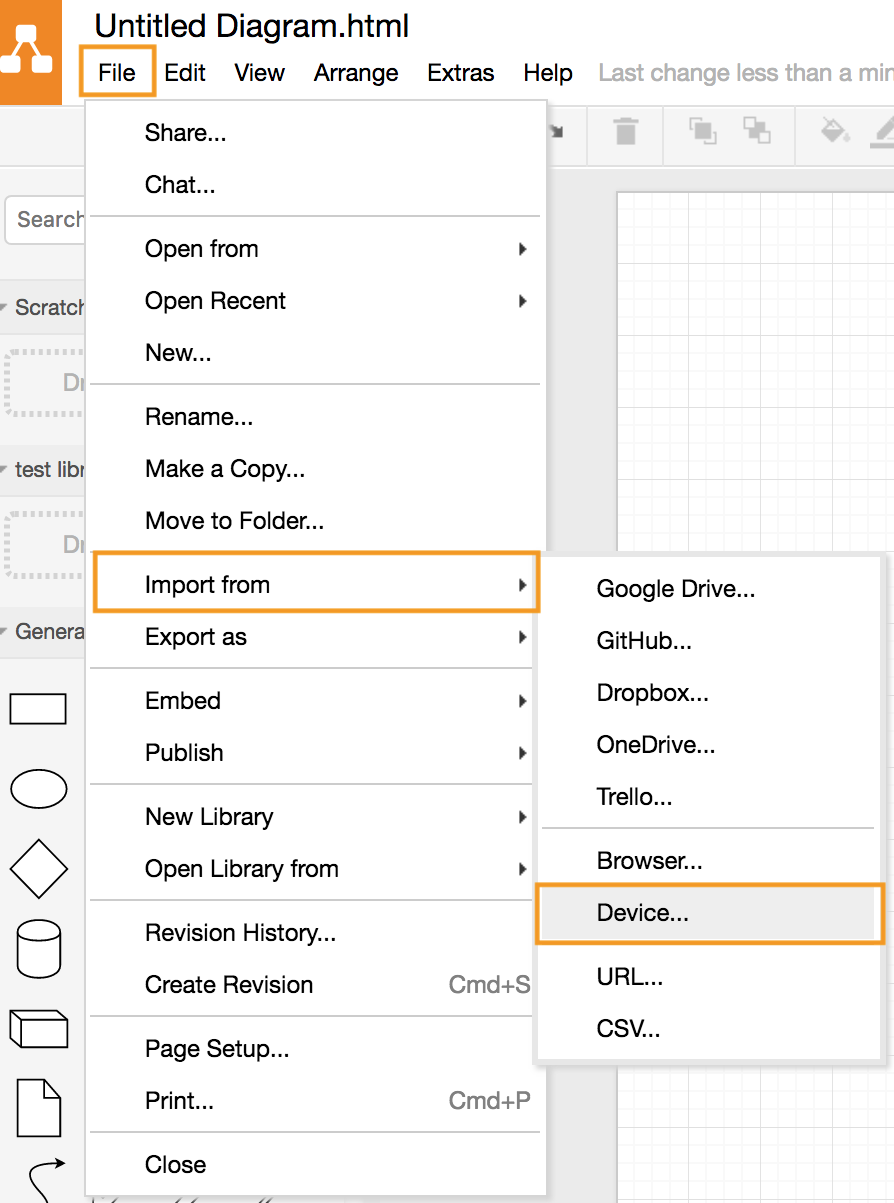 1. 在draw.io中,单击文件>从中导入>设备。或者,您可以从菜单中的一种云服务中选择加载图表。
